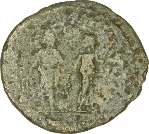 male and female figures side by side holding branches of laurel; she holds statuette of male figure (?) |