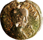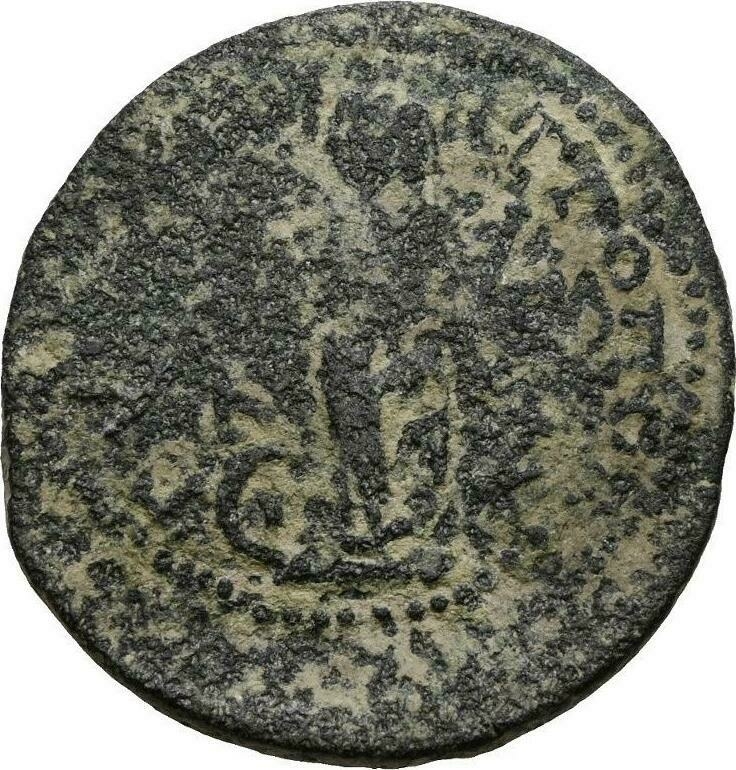 Nemesis standing left, holding cubit rule in left and uncertain object in right; to left, wheel |