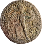 nude warrior armed with spear, sword, helmet, and shield advancing left and looking back |