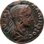 Cybele seated left, holding patera in right and holding transverse sceptre in left which rests on tympanum; at her feet, lion left; to right, lion right |
