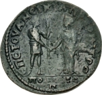 emperor and city goddess joining hands; emperor stands right, resting on sceptre, city goddess stands left with transverse sceptre