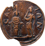 cult statue of Samian Hera, facing, with serpent coiled around her kalathos; on her left, Nemesis standing facing, wearing long chiton with peplos as veil; wheel at feet