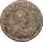 Tyche standing left, wearing kalathos holding rudder and cornucopia