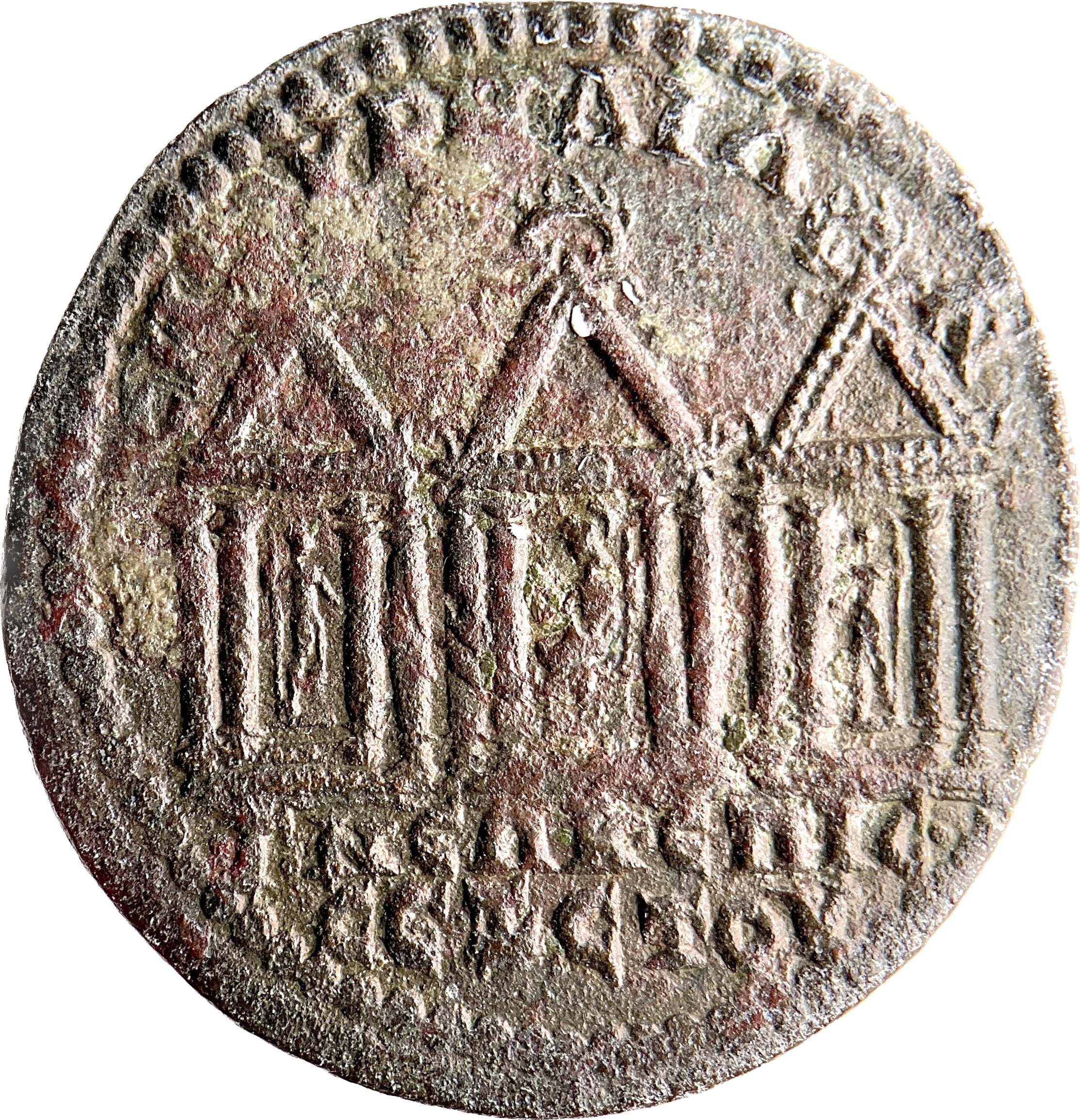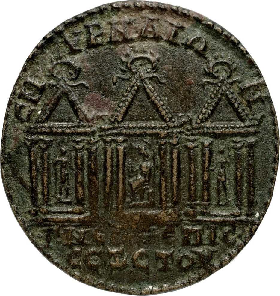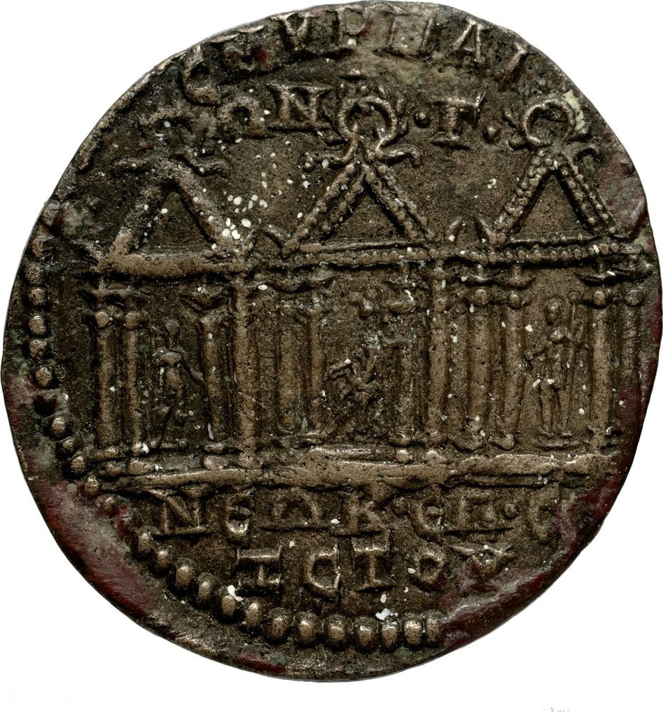 three temples with four columns; centre temple encloses statue of Roma, left encloses statue of Tiberius, right encloses statue of Hadrian |