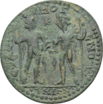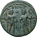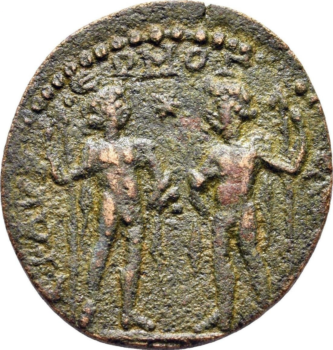 two Dioscuri , nude, standing facing each other and holding spears; between, star |