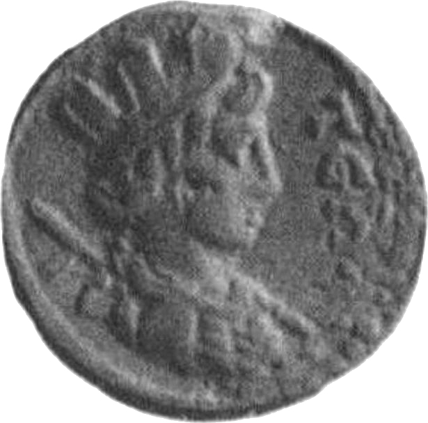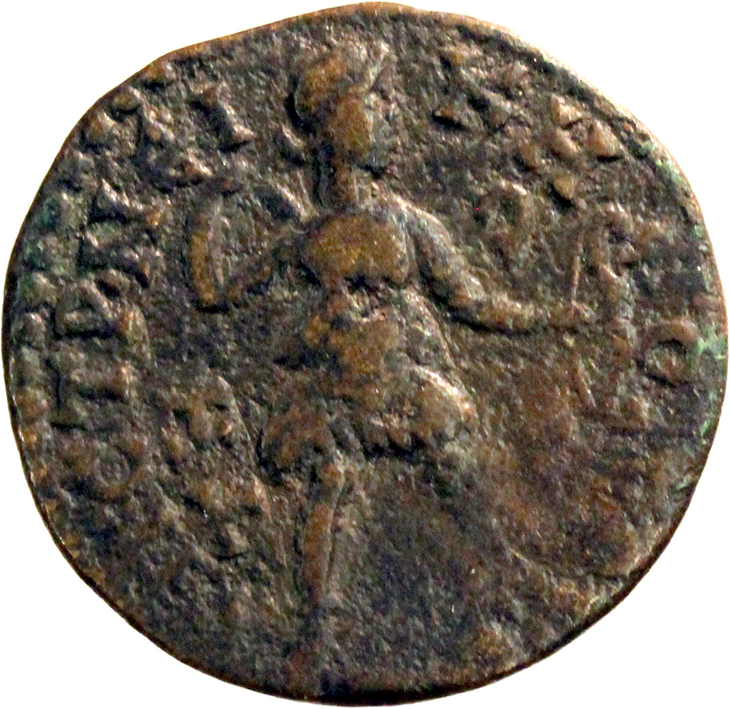 draped bust of Tyche, right, wearing turreted crown; thyrsus on left shoulder