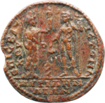 Tyche standing left, holding patera over altar and Dionysiac herm; on right, Dionysus standing left, holding cantharus and thyrsus |