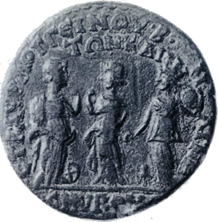 Cybele, with turreted crown, standing left, holding tympanum and patera; at her feet, lion; to left, two Nemeses of Smyrna holding fold of drapery; right figure holds bridle; at their feet, wheel |