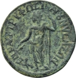 Dionysus standing left, holding cantharus thyrsus; to left, a panther |