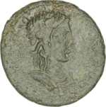 Leto advancing left, head right, holding Apollo and Artemis infants, next to Zeus standing left, holding eagle and sceptre |