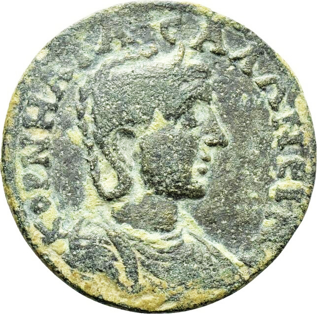 Leto with, billowing veil, holding a twin on each arm and advancing left, head right; to right, Zeus of Laodikeia holding eagle and sceptre |