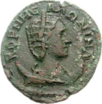 Tyche standing facing, head left, holding Kabeiros in extended right and cornucopia in left; to left, lighted altar |