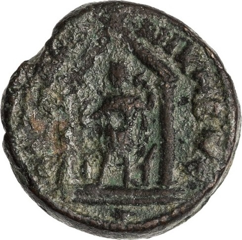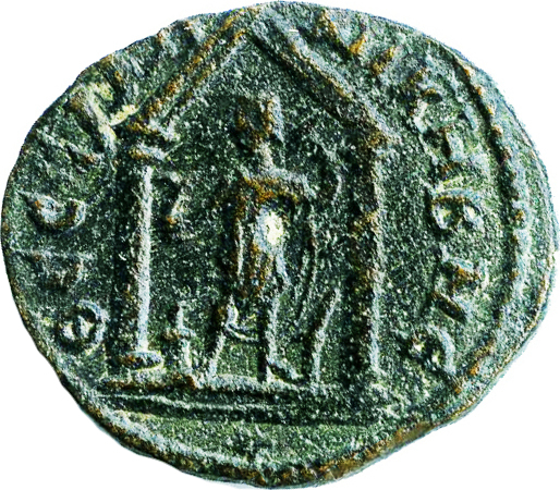aedicula with two columns with gabled roof; within, Kabeiros standing front head left, holding rhyton in right and hammer in left; on ground to left lighted altar, to right, elehpant’s tusk (?)