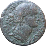 draped bust of Kore Soteira wearing wreath of corn ears, right; below, serpent
