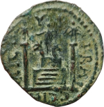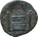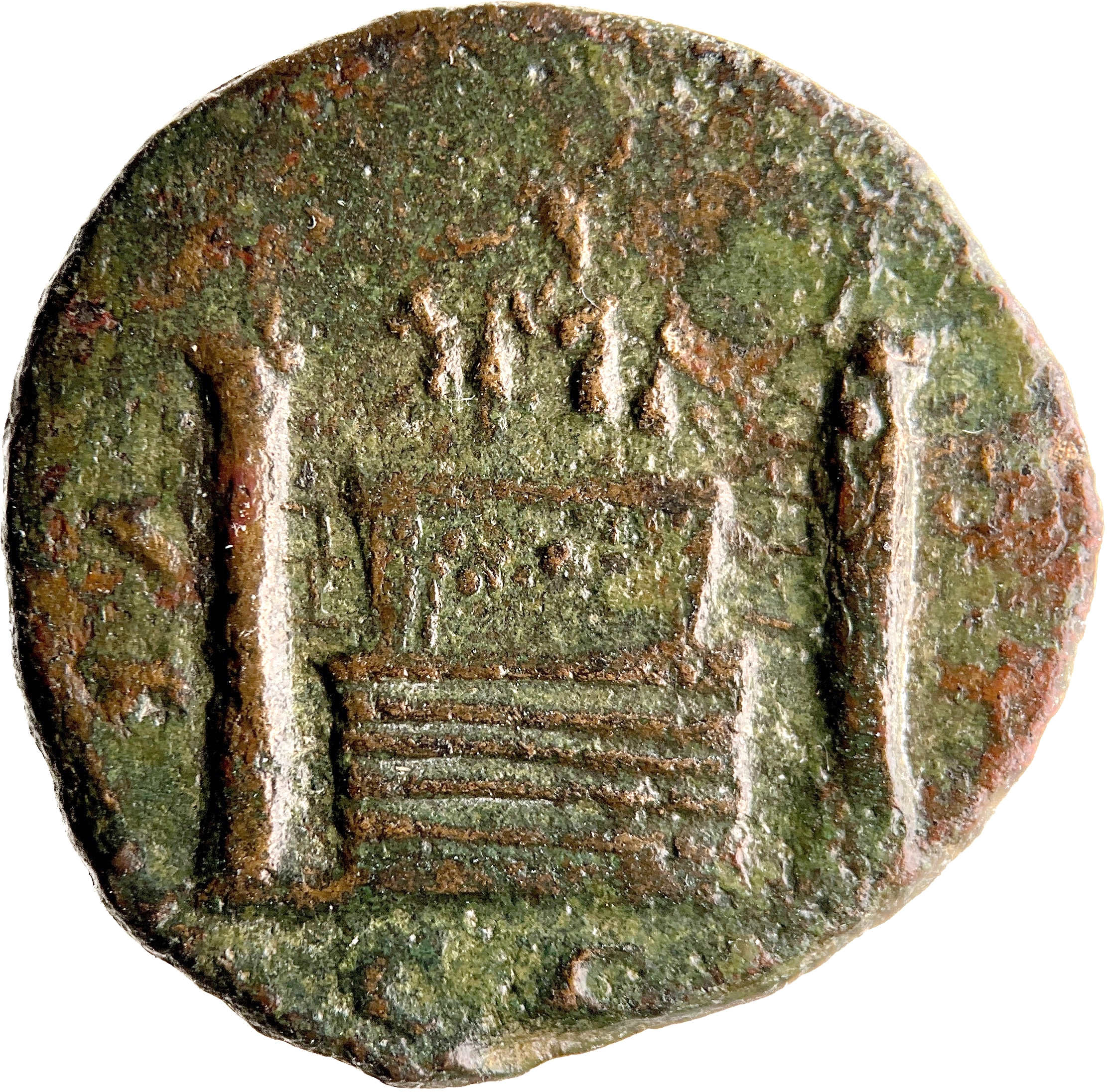 radiate figure, holding a shield and a spear, on facing biga on top of two-storied monument; behind, wall, flanked on either side by a column surmounted by a standing figure, each holding a spear