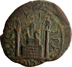 radiate figure, holding a shield and a spear, on facing biga on top of two-storied monument; behind, wall, flanked on either side by a column surmounted by a standing figure, each holding a spear