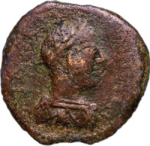 radiate figure, holding a shield and a spear, on facing biga on top of two-storied monument; behind, wall, flanked on either side by a column surmounted by a standing figure, each holding a spear