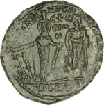 on left, statue of Ephesian Artemis, facing; on right, Asclepius standing right, leaning on serpent-entwined staff |