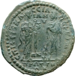 Hygieia standing facing, head right, feeding serpent from patera, facing Asclepius standing facing, head left, leaning on serpent-entwined staff |