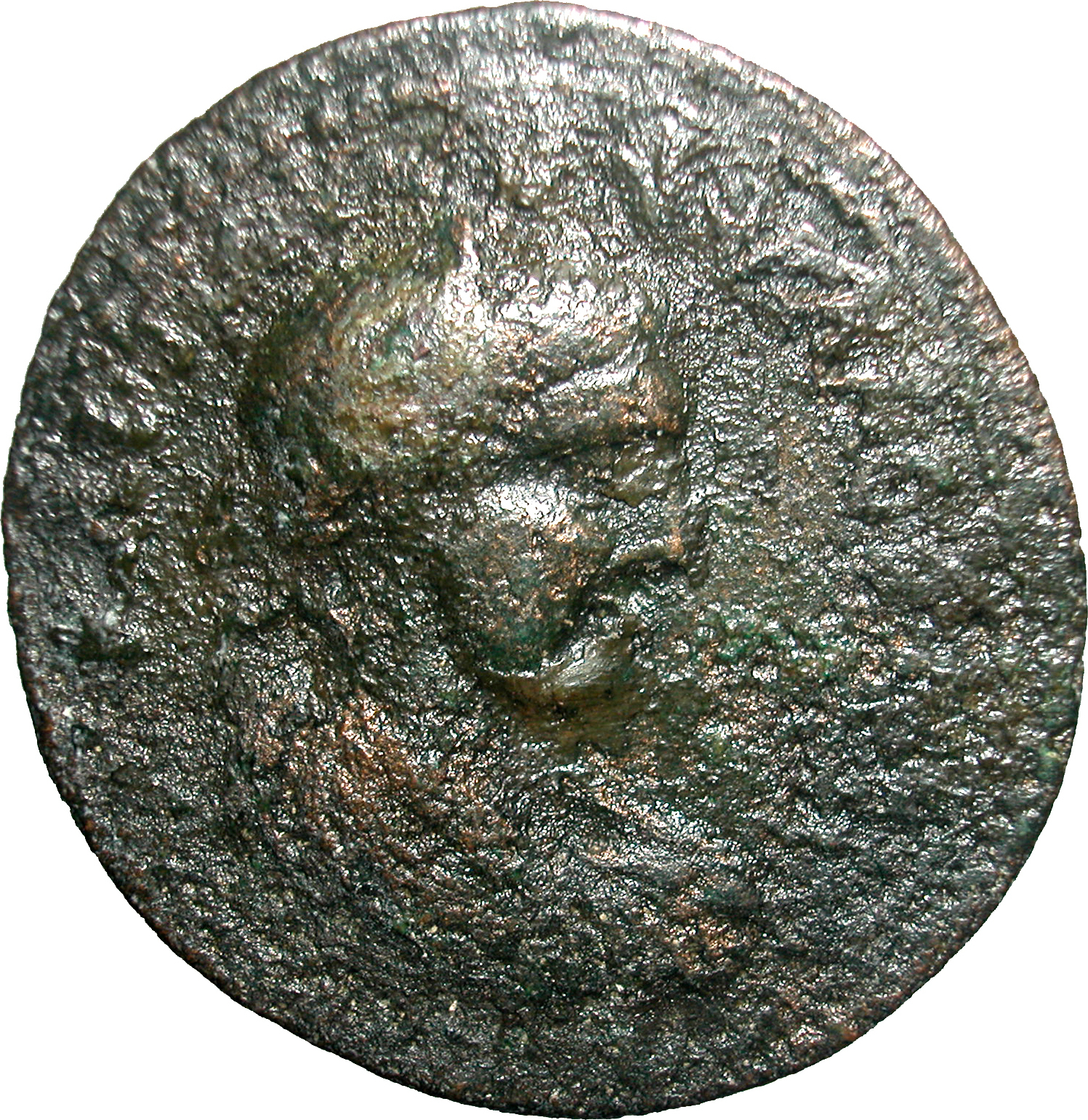 Athena standing right, holding spear in left and clasping right hands with Sarapis standing left, holding transverse sceptre in left; between, altar |