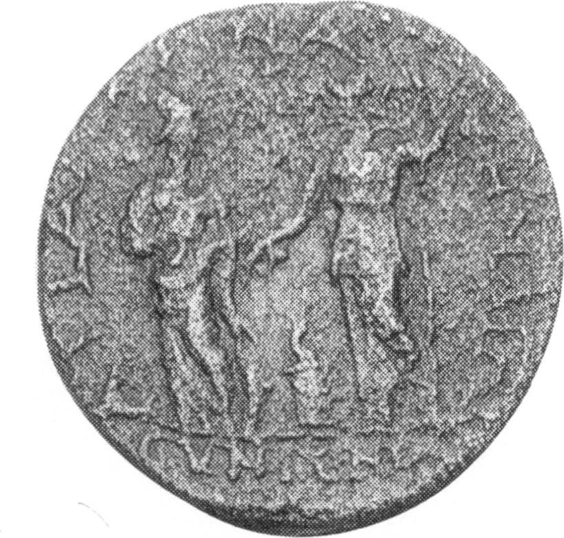 Athena standing facing, head right, resting arm on shield and with left hand at breast facing Athena standing left, holding long spear in left and extending right hand; (between, lighted altar) |