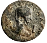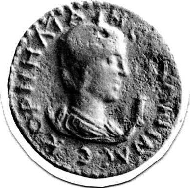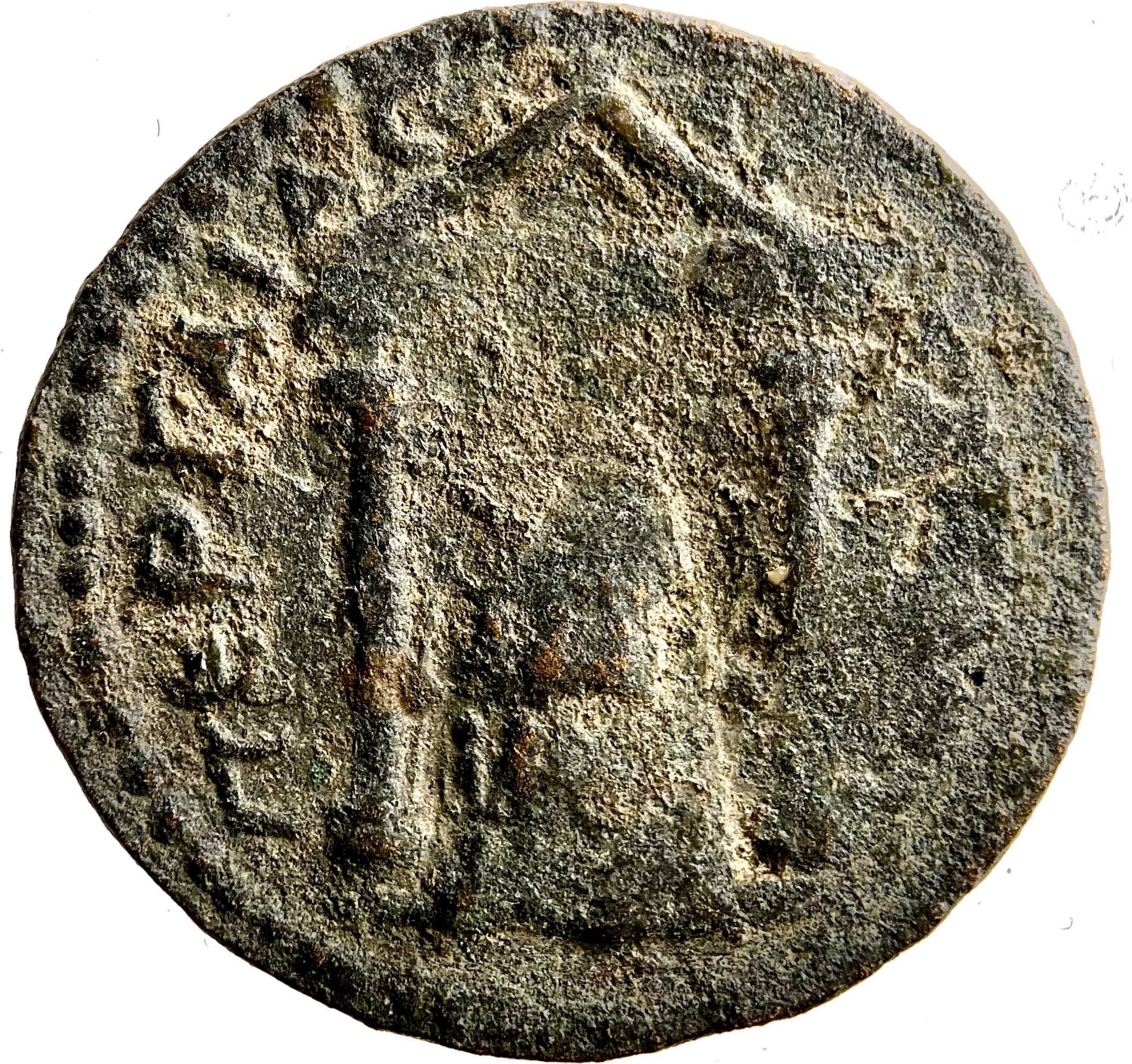 temple with two columns, within which cult image of Artemis of Perge flanked by star and crescent; inscribed entablature; in pediment, letter |