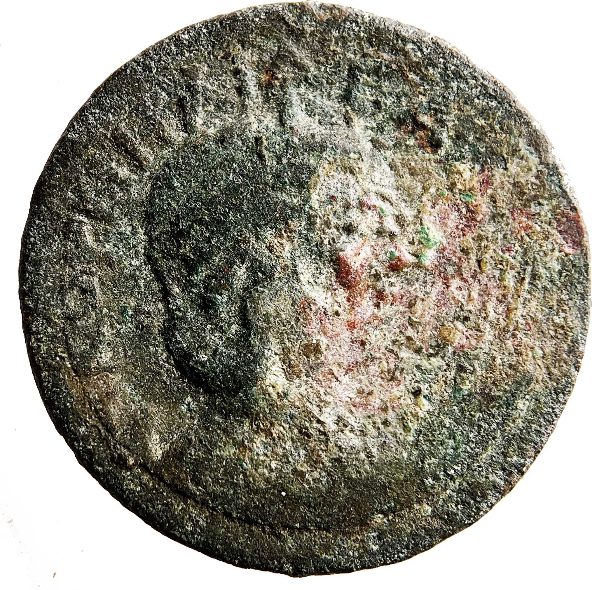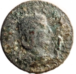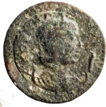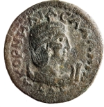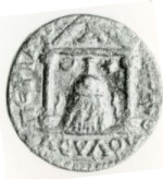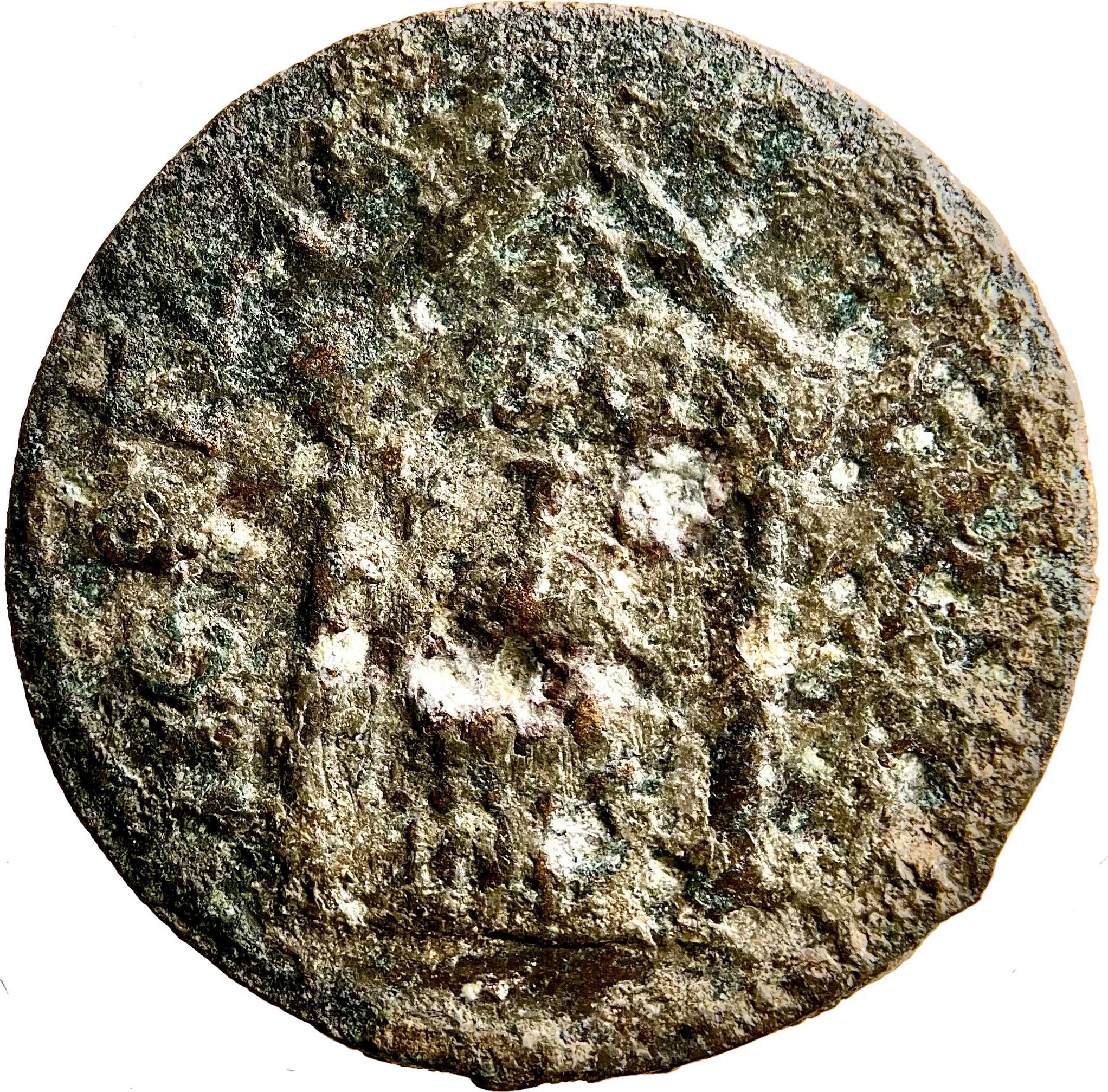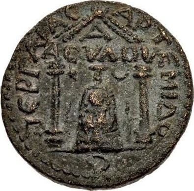 temple with two columns, within which cult image of Artemis of Perge flanked by star and crescent; inscribed entablature; in pediment, letter |