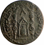 Reverse design small temple with two columns, within which cult image of Artemis of Perge, flanked by two standards surmounted by eagles