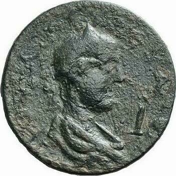 laureate, draped and cuirassed bust of Valerian II, right, seen from rear |