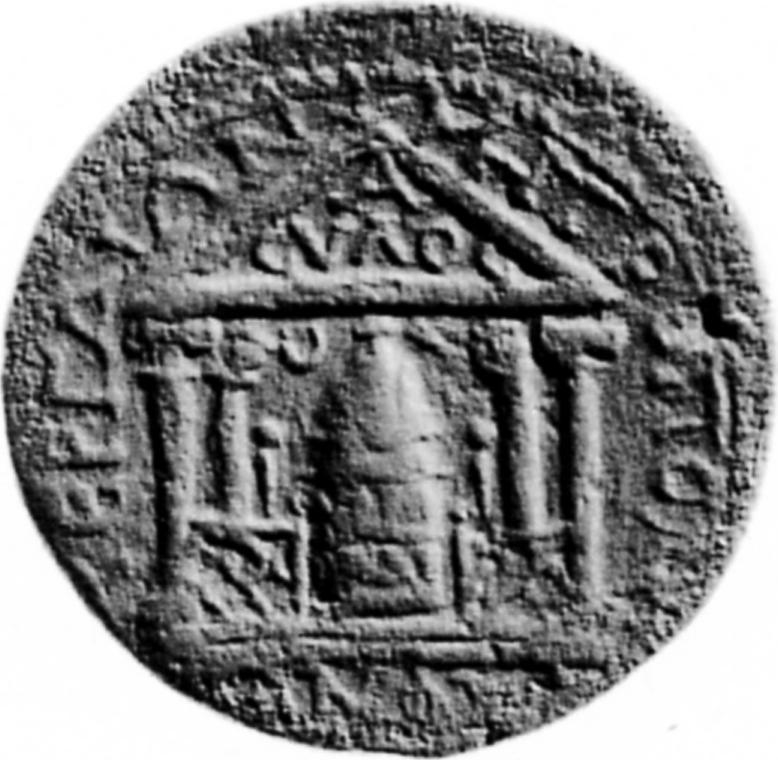 temple with four columns, within which cult image of Artemis of Perge between two statuettes, flanked at top by star and crescent; inscribed pediment |