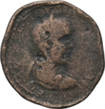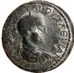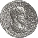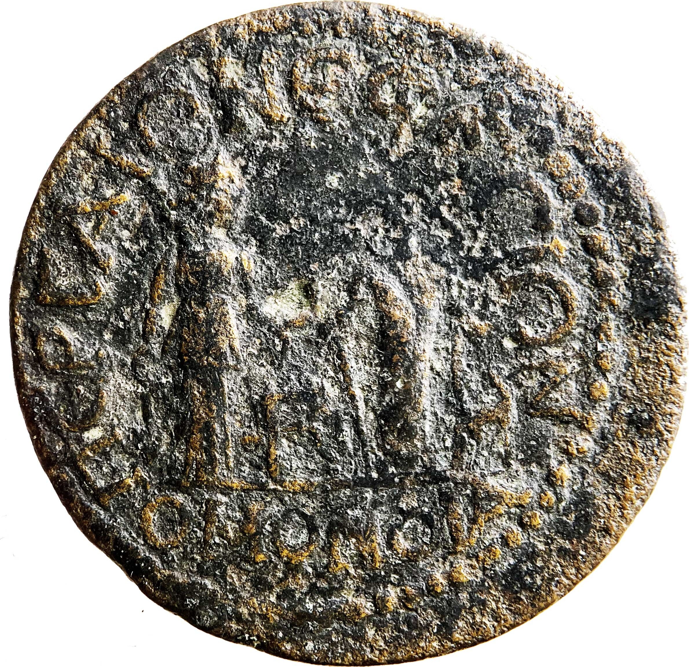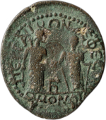Artemis Pergaia standing right, with crescent on head, holding arrow in right and bow in left; on right, Artemis Ephesia facing, with supports |