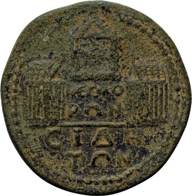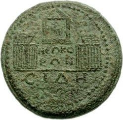 Burrell, Neokoroi, pp. 184, type 11, suggests the top temple is the neocorate temple, containing the emperor on horse, and that the other two may be the temples of Apollo and Athena. She also thought that on 'some examples a male figure can be seen to the right of the horseman', but this is not at all clear, and is perhaps a confusion with the horse's tail (there is only one die)77.