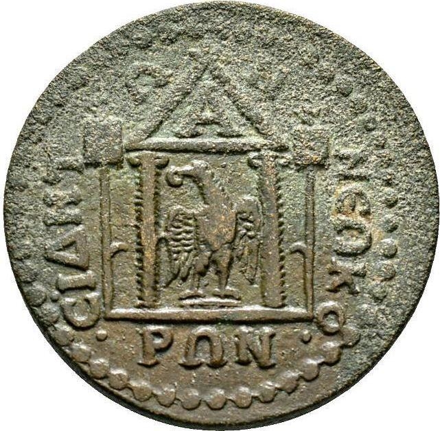 temple with two columns; in intercolumniation, eagle standing right, head left; to left, and right, standards |