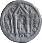 temple with two columns, within which eagle; on either side, inscribed standard; letter in pediment |