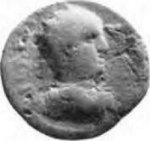 Nemesis standing facing, head right, holding wheel on column in left and holding fold of drapery upward in right; to left, griffin; to right, caduceus