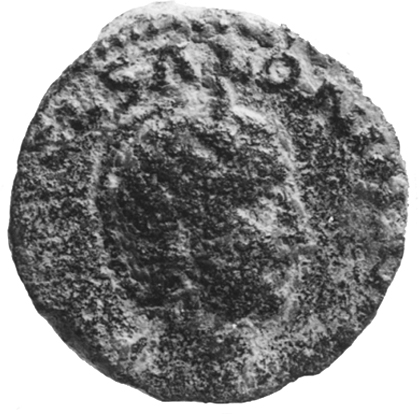 Tyche standing facing., crowned by Victory on column behind her; to left, winged caduceus