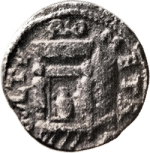 shrine, with flat roof and iconic pillars, seen in perspective right, and with base, from which poles protrude; within, smaller shrine with baetyl between two figures; in ex., murex shell