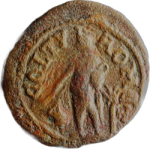 Rouvier: 'Personnage à demi-nu,debout à gauche, la chlamyde autour des reins et du bras gauche, de la main droite baissée, il tient un sceptre et dans la droite un bétyle entouré d'un serpent.' See also https://rpc.ashmus.ox.ac.uk/type/88387.