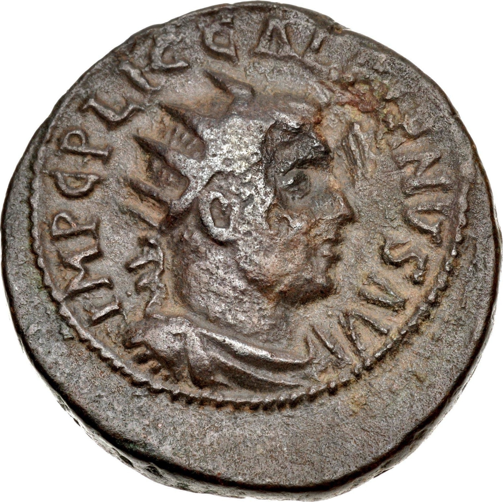 Sacrifice to Melqarth-Hercules. Female figure wearing kalathos standing right, both hands raised above lighted altar before temple with two columns, seen in perspective, containing club of Hercules; to right, murex shell; (above altar, star) |