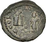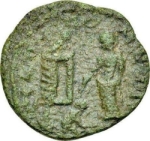 Dido founding Carthage. She stands left holding rule in right and transverse sceptre in left, while to left a mason works atop the gate of a city; below, worker right digs with a pick; behind him, murex shell