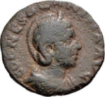 Cadmus advancing right holding spear in left and beckoning behind him with right; to left, murex shell