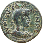"ƐΥΜƐΝƐΩΝ ΑΧΑΙΩΝ; im Feld: ΦΙ-ΛΑ/ΔƐΛΦΙΑ; Preisgefass mit Palmzweigen, darauf: [ΓΑΛΛΙ]ƐΝΗΑ"