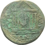 temple with eight columns on podium of three steps with patera in pediment; within, statue of Zeus ?Pandemos seated left, holding Nike in right and resting left on sceptre