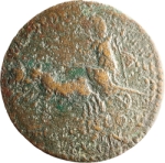 Mên in Phrygian cap and crescent behind shoulders holding pine cone in extended right and resting left on spear, standing left on car drawn by two galloping bulls