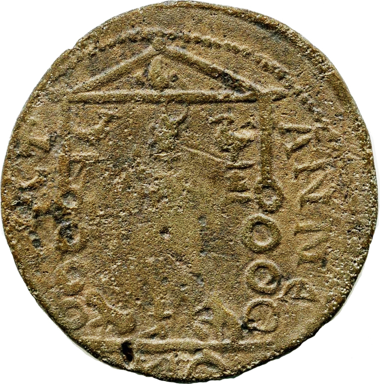 temple with two columns; in pediment, eagle; standing figure of Mên within, crescent on shoulders, holding roll (?) in extended right and pine cone in extended left; crescent above head, flanked by cocks (?) at top and lions at bottom; in front of columns, shields |