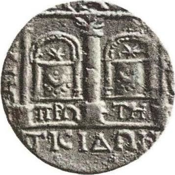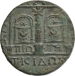 temple with three columns on tall bases supporting architrave; within, two small arched shrines, each supporting small altar with garland and crescent and adorned by a star |