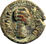 statue of Athena Ilias standing right, wearing kalathos, brandishing spear, holding spindle; shield at her feet