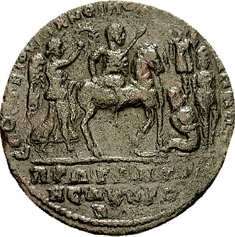 Caracalla on horseback right, holding spear; behind him, Nike advancing right, rising crown; in front of the emperor, trophy with two captives, one seated left, one standing right |