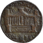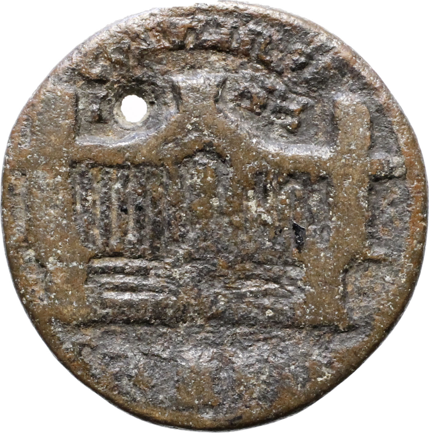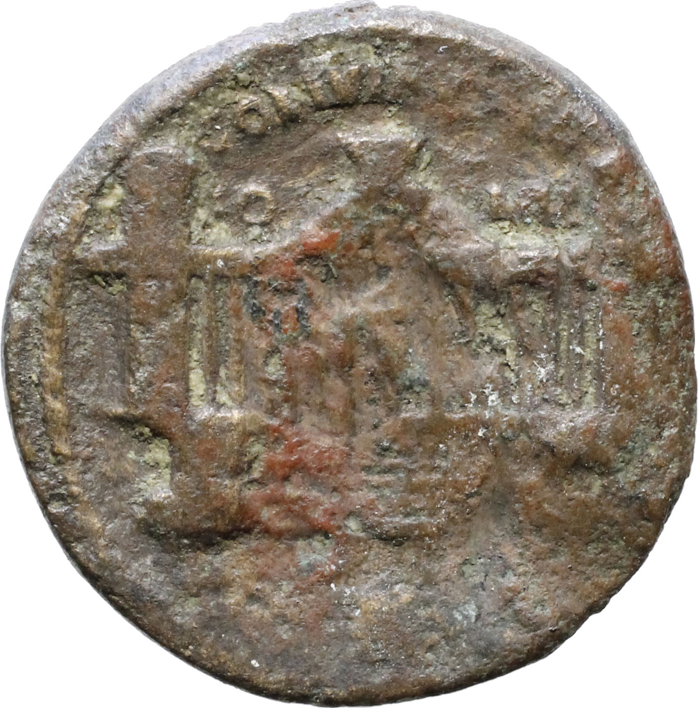 propylaeum of the temple of Jupiter Heliopolitanus with stairway flanked by pedestals leading to a portico with twelve columns flanked by towers; ear of corn in central arch; below, altar |