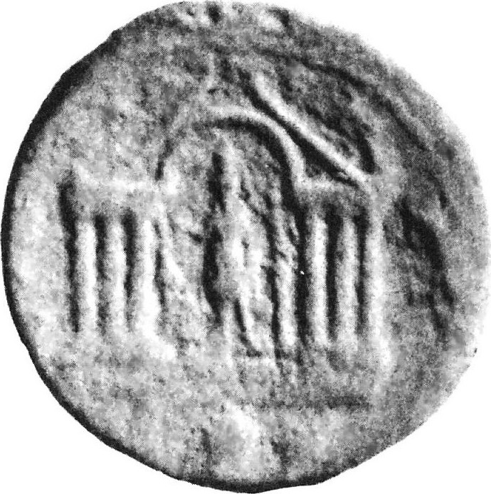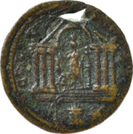 temple with six columns and arched pediment enclosing Astarte standing facing, placing right on trophy to left and holding sceptre, crowned by Victory on column to right; in exergue, palm tree, altar, and murex shell